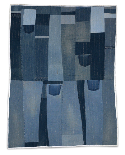 I use a lot of work clothes. And usually, I’m repurposing things, sheets and curtains, tablecloth, old pieces of fabric that someone had in their sewing stash, and they may have passed and someone donated it. Some of the quilts you may see a small pocket, those are my son’s jeans.
